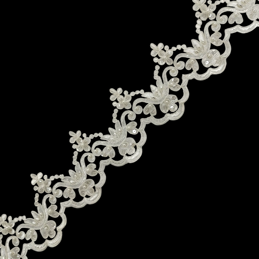 Bridal lace trimming is a delicate, ornamental lace used to embellish wedding gowns, veils, and accessories. Often made from fine fabrics like tulle, Chantilly, or Alencon lace, it adds elegance and romantic detail to bridal attire.